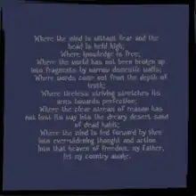 "Where the mind is without fear" (Bengali: চিত্ত যেথা ভয়শূন্য, romanized: Chitto Jetha Bhoyshunno) is a poem written by 1913 Nobel laureate Rabindranath Tagore before India's independence. It represents Tagore's vision of a new and awakened India. The original poem was published in 1910 and was included in the 1910 collection Gitanjali and, in Tagore's own translation, in its 1912 English edition. "Where the mind is without fear" is the 35th poem of Gitanjali, and one of Tagore's most anthologised poems.