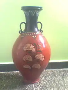 Kashubian ceramics from Chmielno is characterized by the motifs of the Kashubian star, fish-scales, tulips, lilies, wreaths, lilac branches, all complemented by wavy lines and dots. For details of the history of the region, see History of Pomerania.