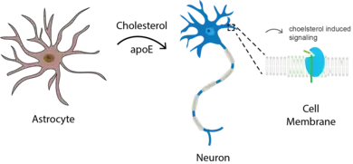 In the brain, cholesterol is synthesized in astrocytes and transported to neurons with the cholesterol transport protein apolipoprotein E (apoE). The cholesterol controls the clustering of amyloid precursor protein with gamma secretase in GM1 lipid domains.[15] High cholesterol induces APP hydrolysis and the eventual accumulation of amyloid plaques tau phosphorylation. The ApoE isotype4 is the greatest risk factor for sporadic Alzheimer's and this allele was shown to increase cholesterol in mice.[16]