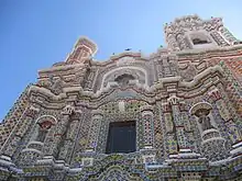 The sanctuary to this Virgin manifestation was established in 1594, with the first church built between then and 1666.[37] The church has suffered damage on various occasions from lightning strikes and from earthquakes.[38] Before the Spanish, the pyramid was considered to be sacred to a female rain deity called Chiconahuiquiahuita (Nine Rains). She was accredited with striking the new church with lightning and supposedly a stone image of her was found at the site the church is now.[32] The lightning strikes have caused minor damage, but the earthquakes have been more serious. In 1864, the church was almost completely destroyed by an earthquake. It took ten years to rebuild and was re-inaugurated in 1873.[38] In February 1930, there was a robbery at the church. The thieves stole the jewelry that the image had been wearing, including a gold crown, a silver halo and precious stones.[39] The next major quake to damage the building came in 1999, which damaged the towers and caused the pilgrims' portal to collapse, with damage to 80% of the building.[38] However, the image of the Virgin, in her Fabergé box, was undamaged.[3]
