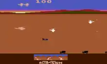 Chopper Command is a horizontally scrolling shooter released by Activision for the Atari 2600 in June 1982. It was written by Bob Whitehead.[1] The player flies a helicopter left and right over a scrolling, wraparound landscape, shooting down enemy airplanes to protect a convoy of trucks below.