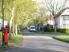 The Chorltonville estate comprises 262 houses in twelve roads, centred on a "village green", The Meade. It measures about 550 yards east-west by 280 yards north-south—around 26 acres. The estate is separated from the central part of Chorlton on the north by Chorlton Brook,[1] and on the south side borders the Hardy Lane residential area and the fields of Hardy Farm in the Mersey Valley Countryside area.[2] Vehicular access is via Claude Road (east) or Brookburn Road (north), and there is a footpath to Hurstville Road on the south side and another towards Hardy Farm to the south-west. The estate and an adjoining football field (owned and occupied by West Didsbury & Chorlton Football Club) are one of Manchester Council's 32 conservation areas. The designation was made in 1991.[3][4]