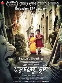 Chotoder Chobi (English: A Story about small people) is a 2014 Indian Bengali language feature film directed by Kaushik Ganguly. The film stars Dulal Sarkar and Deblina Roy in the lead roles. The film is directed by Ganguly and follows his earlier work on Laptop, Shabdo, Apur Panchali and Khaad. The plot revolves around the lives and opinions of a group of dwarfs who work as jokers in a circus.[2] The film was released on 23 January 2015.[3] Produced by Shrikant Mohta of Shree Venkatesh Films, the film's music was scored by Indradeep Dasgupta.[4] The main cast as well as supporting actors were previously non-actors but Sarkar, one of the lead actors in the film, was awarded the Best Actor award at the 45th International Film Festival of India. It won the National Film Award for Best Film on Other Social Issues.[3][5]