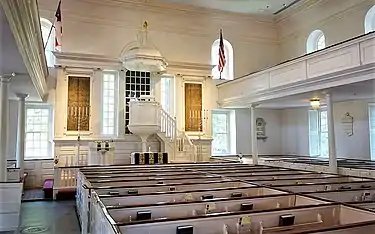 The Anglican congregation that commissioned the church's construction was founded in 1765, when Fairfax Parish was established. The vestry commissioned the construction of two churches, this one, and another at Falls Church. The architect of both buildings was by Colonel James Wren. To finance construction of the church in Alexandria, the vestry raised 31,186 pounds of Oronoco tobacco from parishioners. Construction began in 1765, under the direction of James Parsons. After four years, the church was still unfinished. The vestry relieved Parsons of his duties as overseer of the construction. John Carlyle accepted the position and handed the keys of the completed building over to the vestry in February 1773. During the Revolutionary War, the church was a center of pro-revolutionary activity, with its Rector, David Griffith, being particularly outspoken in favor of independence. After independence, the church survived the disestablishment of the Church of England as the state church of Virginia by the Commonwealth, in large part thanks to private support from parishioners including George Washington.[5] The church is distinctive among Virginia's colonial churches in that its interior was spared the ravages of the Civil War. However, it was occupied by Union troops, and most of the tombstones were lost over the course of the war along with the church's silver. In the winter of 1869 – 1870, following the Civil War, Christ Church established Meade Memorial Chapel as a mission church in the north end of Alexandria.[4]