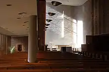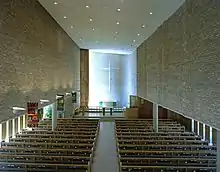The International Style worship building was designed by the firm Saarinen and Saarinen, a father and son partnership of Eliel Saarinen (1873–1950) and Eero Saarinen (1910–1961), the project was Eliel Saarinen's last completed building. The sculptured stone panels were designed by William M. McVey (1922–1976). It was dedicated in 1949, and was acknowledged as an architectural masterpiece from the day it opened. As an early, outstanding example of modern religious architecture in the United States, it was widely published in the architectural, popular, and religious press, and provided inspiration for countless modern churches that were to be built in the 1950s and 1960s.[4] Noted conductor Osmo Vänskä said of the church that "It's a good place to play. The acoustics are good for music—for chamber music—and it's a good place for the audience to listen. It's a place not only for the congregation but also a venue for concerts."[5]