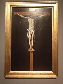 Velazquez's religious paintings had great influence on others due his works on the Passion of Jesus.[12] The passion was the time period before the death of Jesus Christ, which includes numerous events and interactions with Jesus, such as the Last Supper, Jesus's arrest, his crucifixion and death, his burial, etc.[12] For the Last Supper, Jesus imposed that bread and wine would symbolize the body and blood of Christ.[13] It is important to recognize that after the Crucifixion of Christ, in remembrance of Jesus, followers would consume bread and wine for a monthly communion, also known as Transubstantiation.[13] With great influence of Transubstantiation, the body of Christ became overemphasized.[14] In Velazquez's painting of Crucifixion of Christ, Christ's severe body was greatly influential to followers of Christ to glorify God.[15] Believers of Christ felt that the painting would evoke their soul for the desire to praise God.[15]