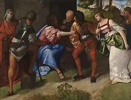 The picture has been variously attributed to Bonifacio, Cariani, Romanino, Sebastiano del Piombo, Domenico Campagnola, Domenico Mancini, Giorgione, and Titian. The subject, too, has been contested; Johannes Wilde and others argued in favour of the Old Testament story of Susanna and Daniel.[2] Most scholars now accept the subject of the painting as the New Testament story of Jesus and the woman taken in adultery,[3] and attribute the painting to Titian.[4]