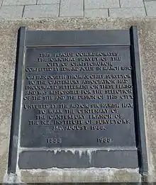 The European settlement of Christchurch was undertaken by the Canterbury Association, which was founded in London in 1848. That year, the Canterbury Association sent out Captain Joseph Thomas, accompanied by surveyors, to select and prepare a site for settlement. Thomas originally placed the principal town of the proposed settlement at the head of Lyttelton Harbour / Whakaraupō, but when he realised there was insufficient flat land there to meet the Canterbury Association's requirements, he relocated Christchurch to where he had previously placed a town called 'Stratford' at a point on the Avon where those coming up the river first encountered slightly higher, drier ground.[7] Back then, the Avon River / Ōtākaro was navigable as far as 'The Bricks' just upstream of the Barbadoes Street bridge. The site is these days marked by a riverbank cairn. The site got its name when the Deans Brothers in the 1840s had shipped bricks for their Riccarton homestead, located further up the river, which they unloaded in this location.