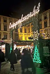 With around 140 market stands, it now has around three million visitors every year from all over the world. In addition to the extensive musical-cultural accompanying program, the almost 30-meter-high Christmas tree in front of the town hall, with around 2,500 lights, is donated every year to the citizens of Munich by a different town from Austria or Italy. As a reward for the gift, the municipality can present itself in the inner courtyard of the town hall and operate a Glühwein stand. The high interest of non-municipal communities for this in this self-presentation position, forced the organizers to create a multi-faceted waiting list.[1] The market is usually open daily from the Friday before the first Advent Sunday, until Christmas Eve.
