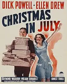 Christmas in July is a 1940 American screwball comedy[2] film written and directed by Preston Sturges, and starring Dick Powell and Ellen Drew. Based on Sturges' unproduced 1931 play A Cup of Coffee, it follows an ambitious clerk who is tricked into thinking he has won $25,000 in a slogan contest for a coffee company, and begins using his believed winnings to fulfill his dreams. It was Sturges' second film as writer-director, after The Great McGinty (also 1940).