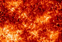 The density of the Sun's chromosphere decreases exponentially with distance from the center of the Sun by a factor of roughly 10 million, from about 2×10−4 kg/m3 at the chromosphere's inner boundary to under 1.6×10−11 kg/m3 at the outer boundary.[4] The temperature initially decreases from the inner boundary at about 6000 K[5] to a minimum of approximately 3800 K,[6] but then increasing to upwards of 35,000 K[5] at the outer boundary with the transition layer of the corona (see Stellar corona § Coronal heating problem).