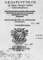 - Evidence: in Groatsworth of Wit, Robert Greene writes about "an upstart crow, beautified with our feathers, that with his 'tiger's heart wrapped in a player's hide', supposes that he is as well able to bombast out a blank verse as the best of you, and being an absolute Johannes fac totum, is in his own conceit the only Shake-scene in a country." Possibly directed at Shakespeare, this is a reference to a line in 3 Henry VI, when York refers to Margaret as a "tiger's heart wrapped in woman's hide" (1.4.137). As Groatsworth was registered in the Stationers' Register on 20 September 1592, this means that True Tragedy must have been on stage prior to 23 June 1592, as that was when the government shut the London theatres due to an outbreak of plague. To have been on stage by June 1592, the play was most likely written sometime in 1591.[52][53]