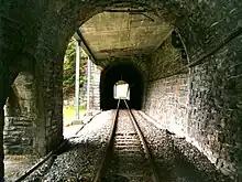 The rest of the line contains many civil engineering structures, including a total of 41 bridges,[2] 19 tunnels and 12 avalanche-protection galleries. The largest structures are the Langwieser Viaduct, the Gründjitobel Viaduct—both in the territory of the former municipality of Langwies—and the Castielertobel Viaduct between Calfreisen and Castiel. The longest tunnel is the 399 m-long Lüener Rüfe tunnel.