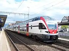 Stadler KISS (class RABe 511) running as the Rheintal-Express Chur–Wil at a stop in St. Margrethen.