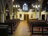 Some of the stained glass windows are dedicated to the dead and others (such as the east window) depict 16 saints and the Lamb of God with a Banner of Victory at the top. The window at the south wall of the chancel depicts the Christian virtues Faith, Hope and Charity. The glass lights, designed by Heaton, Butler and Bayne were made by the Chance Brothers of Oldbury and were dedicated in 1912.[10] The windows in the south wall, like the east windows, are by Heaton, Butler and Bayne. The west end of the church is dominated by the gallery, which was designed and constructed by Peter Farmer in 2002. Beneath this is the Fred Oakley Room, a Campton resident and benefactor of the church who died in 2000. The two war memorials on either side of the entrance to the Oakley Room commemorate the men of Campton who gave their lives in World War I and World War II. These memorials were originally sited at each side of the North door. The oak screens that form the east and north sides of the ringing chamber are 15th century and were formerly part of the chancel screen.