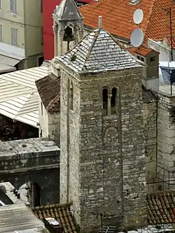 The Belltower of the Church of Our Lady of Zvonik (Croatian: Crkva Gospe od Zvonika u Splitu) is a disused Roman Catholic church in Split, Croatia. Built into a small space (an early guardhouse) within the ancient Iron Gate of Diocletian's western wall. Today little survives of the building, apart from the belltower, one of the oldest in Croatia.