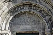 The principal facade (oriented to the west) is marked by a single portico with three semi-circular arches, decorated with animals and birds, supported on rounded-columns.[1] This triumphal arch entrance-way, is constructed over two limestone capitals and has a cubic appearance, extending from the main facade of the church.[1] Many of the decorations are thought to be reused elements from an older building, likely from a Suebi-Visigothic construction (and has been the centre of historical speculation since the 17th century).[1][2] The triumphal arch is surmounted by a Romanesque slit-window, flanked by rounded capitals, and finally surmounted by a Neolithic cross on its apex. Within the cantilever tympanum there is an inscription dating to 1767.[1]