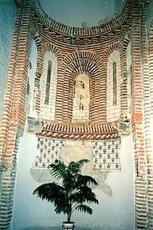 In the threshold, there are three prolonged brick apses, the main one being larger and more protruding, with two blind semicircular arcades in the middle; and in the upper one, two orders of windows with frames, separated by simple friezes of angled brick that are interrupted in the protruding panels. The lateral apses reduce their windows in favor of the upper arches and suppress the saw-toothed windows due to the lower overall height.[2]