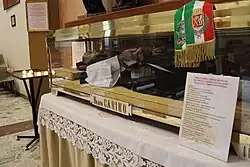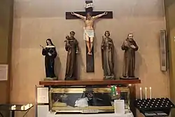 The church contains the body of Blessed Carino of Balsamo.[20] Carino's body was kept in Forli Cathedral until November 4, 1964, when at the interest of parish priest Don Carcano it was reassembled in a simulacrum and clothed in the habit of the Dominicans, together with the head and the remaining relics (kept since 1934 in the old church);[note 1][21] everything was kept inside a metal and glass urn and placed under the altar of the crypt.[22] In the late 1990s it was moved to the left wall in the center of the nave.[9]
