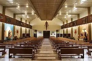 The plan of the church is in the shape of a Latin cross with the arms widening in a trapezoid shape toward the center of the transept, where the main altar, made of light marble, is located. It has a single large nave, with plastered and painted masonry and whose floor is made of light Versilia marble with dark red marble squares;[3] this is characterized by the rhythm of reinforced concrete pillars, painted mustard-colored, at the top of which they are connected through trusses. Surrounding the chancel are the sacristy and penitentiary. In the upper part of the masonry is housed a band of wood-effect coated reinforced concrete, which runs around the entire perimeter of the liturgical hall. On this band are paintings depicting the Stations of the Cross, made by the painter Compagnone.[6] Lower down are placed, three on each wall, paintings dedicated to the life of St. Martin of Tours. On the right aisle is a chapel dedicated to Our Lady, while the left aisle houses statues of Saints Rita of Cascia, Anthony of Padua, Joseph and Padre Pio, as well as the urn of Blessed Carino of Balsamo. Above the entrance portal, in the upper part of the counter facade, is housed the sculpture of the Risen Christ. Several banners cover the walls.[19]