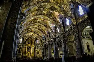 The interior of the church was completed between 1690-1693, and was decorated by Juan Pérez Castiel in baroque fashion. It has frescoes, depicting the lives of San Nicola and Peter of Verona, along with virtues and allegories, designed by Antonio Palomino and completed by Dionis Vidal. The chapel altarpieces include works by Juan de Juanes, Fernando Yáñez de la Almedina, Jerónimo Jacinto de Espinosa, and José Vergara Gimeno.