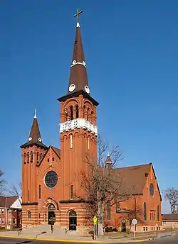 Bishop John Ireland was noticing the development of the southwestern Minnesota prairie land in the late 1870s. He directed Mayor Ben Thompson to scout out sites in the area. In 1877, the bishop established a new parish in Adrian, which at the time had only three houses, two stores, one hotel, a wayside station, and only one practicing Catholic. The new parish was presided over by Father C. J. Knauf and named after Saint Adrian the warrior. The first building was a wood-framed building, built in 1878 at a cost of $700. In 1887, a brick-veneered building was built, but it was destroyed by a fire on December 24, 1899. $30,000 was raised toward the cost of a new church, whose cornerstone was laid on July 4, 1900. The congregation started worshiping in the new church the following year.[2] The building was listed on the National Register of Historic Places in 1980. The parish is now part of a four-parish cluster with Church of St. Kilian in Wilmont Township, St. Anthony in Lismore, and Our Lady of Good Counsel in Wilmont.[3]