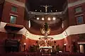 Until the Second World War the interior of the church was equipped with the altars and church furniture, and it was gradually finished later, whereas the monumental bell tower with 52m in height and 9m in diameter was built in 1962 according to the slightly modified designs of the architect Plečnik, and according to the instructions of his student Janez Valentinčić. Along with the bell tower, he also made designs for the entrance porch, stone floor in the presbytery, benches, organ and chandeliers. Some of the Slovenian artists also took part in the designing: stonemasons, founders and carpenters, out of which the most distinguished was a sculptor Božo Pengov. The main altar of the St. Anthony is in the apse, with the bronze sculpture of the patron of the church holding the infant Jesus Christ, the work of Ivan Meštrović, set in 1935. The altar of the Heart of Jesus and the Lady's altar (Maria's Annunciation) were set in the north and south conches, observed from the main altar, and further on there are the altars of St. Josif and St. Francis of Assisi, as well as the unfinished altar of the Christ's suffering. In the churchyard towards Bregalnička Street, there is a two-storey building with neobaroque gable, in which there is a little sculpture of St Anthony with the baby Christ. That building is intended to be a parsonage and a friary, where the head of the monastery guardian dwells.