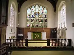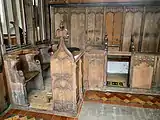 The sedilia in the chancel are believed to be 19th-century apart from the 15th-century moulded jambs. The stalls or pews inside the east side of the rood screen – three on either side of the opening – have shaped and moulded divisions and curved and moulded cappings. It is believed that these seats were brought to the church from another site. It is known that they were re-positioned during the 1880 restoration from the south wall of the chancel. They may well have been for the six priests known to be in the village in 1490.[4] The carvings on the seats on the north side are: modern; a mitred ecclesiastic; a collared animal; a bird with long wings and turned-back head. On the south side: an angel; a winged beast; an animal (mutilated); a defaced head. The two seats either side of the entry have misericords carved, with on the north side a crouching man and a demon's head, while on the south side an ape and grapes in vine leaves. With the exception of the first these carvings possibly date to about 1442.[1][2]