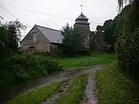 The architectural historian John Newman describes St Maughan's as "a complete Perpendicular church, at first sight".[2] On closer inspection, the significant later alterations become obvious. The church is flanked by a farmhouse and barns in the tiny hamlet.[2] Of old red sandstone, it has a combined nave and chancel, with a corresponding aisle and a tower, capped with a two-storeyed timber belfry which is entirely Seddon's work.[2] The interior contains a "remarkable" timber arcade,[2] which dates from the medieval re-modelling.[1] On the south wall is a memorial plaque to General Sir Robert Brownrigg of nearby Hilston Park, a noted general in the Napoleonic Wars.[1]