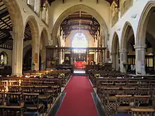 There is a chancel, a nave of five bays, north aisle, and modern south porch. With the arrival of the British Army in the area in the early 1850s the church proved to be too small for the sudden influx of residents, and the building was extended in 1859. The nave was restored and the north aisle added in 1868, so that the tower, the chancel and the Lady Chapel extension of 1380 are the only ancient parts of the original church to survive.[2] The main door to the original church is today the one giving access to the tower. The so-called 'Lady Chapel' is in fact the original church and arches to its left were once the outer wall.[14] In 1912 a new nave, chancel, and North arcade were added to a design by Sir Thomas Jackson, R.A.[15]