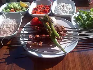 Ciğer kebabı (English: liver kebab) is a common type of skewered meat served in Anatolian cuisine, usually eaten with sliced onions, salad and bread.