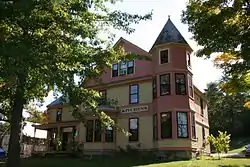 The Cicero Goddard Peck House stands in the village Hinesburg, on the south side of Mechanicsville Road just east of its junction with Vermont Route 116. It is a 2+1⁄2-story wood-frame structure, basically L-shaped, with a main block whose gable is perpendicular to the road, and a side ell with a cross gable. A single-story porch is set at the crook of the ell, and a polygonal three-story tower projects from the front right corner. The exterior is finished in a combination of wooden clapboards and scallop-cut shingles, and there is a projecting single-story polygonal bay on the front facade. The porch is supported by turned posts, and has a balustrade with square balusters. The interior of the house retains many original period finishes and features, including pocket doors, a china cabinet in the dining room, and original moulding and floors.[2]