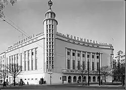 The Cine-Teatro Monumental was designed by the architect Raúl Rodrigues Lima (1909-1980) and was situated at the Praça Duque de Saldanha in Lisbon. It followed the modernist style appreciated by the authoritarian Estado Novo government of the time and contained a cinema and a theatre. The building was commissioned in 1943 by the Minister of National Education, Mário de Figueiredo, and construction was approved in 1946. The structure was covered with stone and ornamented on one of its corners with a large column, topped by an armillary sphere (a symbol much-loved by the Estado Novo). The main public entrance, facing Praça Duque de Saldanha, had seven arched doors with direct access to the ticket offices. Internal decoration included chandeliers, paintings by Maria Keil and sculptures by Euclides Vaz.[1]