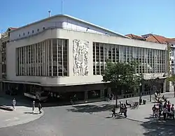 The main stage and exhibition hall occupies the entity of the space, with the "L"-shaped foyer opening to the square and road.[2] The ceilings of the exterior spaces, tribune and balconies are covered stucco with circular, copper lamps.[2] Over the lateral doors that access the theatre balconies are ceramic elements in the forms of polychromatic wings, in bass relief with birds and flowers.[2]