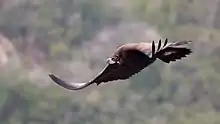 The cinereous vulture is distinctly dark, with the whole body being brown excepting the pale head in adults, which is covered in fine blackish down. This down is absent in the closely related lappet-faced vulture (Torgos tracheliotos).[5][6] The skin of the head and neck is bluish-gray and a paler whitish color above the eye. The adult has brown eyes, a purplish cere, a blue-gray bill and pale blue-gray legs.[5][6] The primary quills are often actually black.[6] From a distance, flying birds can easily appear all black. The immature plumage is sepia-brown above, with a much paler underside than in adults. Immature cinereous vultures have grey down on the head, a pale mauve cere and grey legs.[6] Its massive bill is one of the largest of any living accipiterid, a feature enhanced by the relatively small skull of the species. The exposed culmen of the cinereous vulture measures 8–9 cm (3.1–3.5 in).[15] Only their cousin, the lappet-faced vulture, with a bill length of up to about 10 cm (3.9 in), can rival or outsize the bill of the cinereous.[5] The wings, with serrated leading edges, are held straight or slightly arched in flight and are broad, sometimes referred to as "barn door wings". Its flight is slow and buoyant, with deep, heavy flaps when necessary. The combination of huge size and dark coloration renders the cinereous vulture relatively distinct, especially against smaller raptors such as eagles or buzzards. The most similar-shaped species, the lappet-faced vulture (with which there might be limited range overlap in the southern Middle East), is distinguished by its bare, pinkish head and contrasting plumage. On the lappet-face, the thighs and belly are whitish in adult birds against black to brownish over the remainder of the plumage. All potential Gyps vultures are distinguished by having paler, often streaky plumage, with bulging wing primaries giving them a less evenly broad-winged form.[5] Cinereous vultures are generally very silent, with a few querulous mewing, roaring or guttural cries solely between adults and their offspring at the nest site.[6]