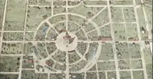The only drawings of Circleville before its squaring were made by G. F. Wittich. He made sketches of the courthouse, the circle, and the other buildings in 1836. Wittich used these drawings along with information from residents to create a map around 1860, of which he produced a watercolour rendition in 1870.[7]: 36