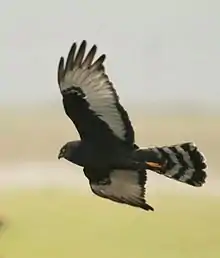 The black harrier (Circus maurus) is a medium-sized African harrier whose range extends from South Africa to Botswana and Namibia. It has a wingspan of 105–115 cm (41–45 in) and a body length of 44–50 cm (17–20 in).[2] When perched, this bird appears all black. However, in flight, a white rump and flight feathers becomes visible. Its morphology is comparable to that of other harriers, with narrow wings, a slim body, and a long tail. Male and female plumages are similar. Juveniles have buff under-parts and heavily spotted breasts.