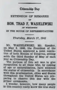 - ↑ Congressional Record, H1941, Appendix to the Congressional Record, p. A1473, Extension of Remarks of Hon. Thad F. Wasielewski of Wisconsin, March 27, 1941, RE: Citizenship Day