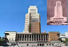 Construction began in 1935 and was inaugurated on July 16, 1941, although the actual building differs from the original 1929 Cravotto model;[4] his main tower measured 114m, which would have become the tallest building in the city, for financial reasons rose to only 78m, remaining in second place after the Palacio Salvo. It also lacked the brick siding. The side wings, the underground concourse, and the garage were built later, giving the building its current appearance. While not the tallest building in Montevideo, its location on 8 de Julio Avenue, built on the crest of a ridge or long hill, makes the building look more impressive. The area of the building had begun development in at least 1867.[5]