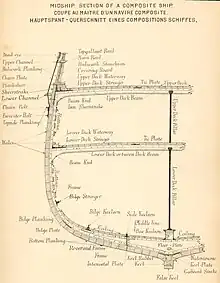 City of Adelaide is a composite ship with timber planking on a wrought-iron frame. This method of construction provides the structural strength of an iron ship combined with the insulation of a timber hull. Unlike iron ships, where copper would cause corrosion in contact with the iron, the timber bottoms of composite ships could be sheathed with copper to prevent fouling. The iron frames meant that composite ships could carry large amounts of canvas sail. Composite ships were therefore some of the fastest ships afloat.[7]