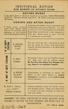 One aspect of the Cold War civil defense program was the educational effort made or promoted by the government.[7] One primary way in which they did this was the publication and production of federally funded films that were distributed to the mass public. In Duck and Cover, Bert the Turtle advocated that children "duck and cover" when they "see the flash". In this film, children are instructed to "kneel with their backs facing the windows, eyes shut, their hands clasped behind their backs."[8]: 17 Duck and Cover also reached audiences through printed media and radio waves. This included a 14-minute radio adaptation, a 16-page coloring booklet, and a nationwide newspaper serialization.[8]: 23 The image of Bert the Turtle was often seen as a way to defuse tensions related to nuclear weapons. The creators of the cartoon "were forced to pick their way delicately through overly glib depictions of nuclear war on one hand, and terrifying descriptions prescribing hysteria and panic on the other."[9] Thus, children were able to adapt to a world of panic and come to terms with the existence of the bomb while also learning how to prepare for the possibility of nuclear disaster.