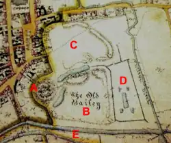 Tithe map of Clare Castle in 1846: A – Motte and keep; B – Inner bailey; C – Outer bailey; D – site of former water gardens; E – New Cut (Stour)