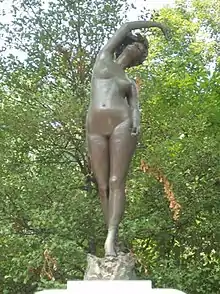 In St. Louis three of Garrett's large pieces could be seen at the Mary Institute, the Eugene Field School and McKinley High School. A fourth, posed by a St. Louis girl and named Carrie Kingsbury or Awakening of Spring (1902),[5] stands still today at the entrance of Kingsbury Place adorning the Union Boulevard gateway.[4] The Kingsbury piece took two years of work to Garrett and once unveiled, the sensual nudity of the girl caused such an uproar that Garrett used the $7000 ($236,762 in 2022 dollars) compensation to move to Paris. A number of smaller pieces were in many of St. Louis' finest homes. She was splendidly remunerated, busts bringing her $1,000 ($29,216 in 2022 dollars), and other pieces in proportion.