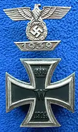 A holder of the 1914 Iron Cross could qualify for the same grade of the 1939 Iron Cross. To permit the two awards to be worn together, a "1939 Clasp" (Spange) was established to be worn with the original 1914 Iron Cross.[1] It depicted a national eagle clutching an oak leaf wreath surrounding a swastika above a trapezoid bearing the year 1939.[1]