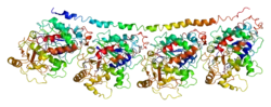 The human TUBB3 gene is located on chromosome 16q24.3, and consists of 4 exons that transcribe a protein of 450aa. A shorter isoform of 378aa derived from alternative splicing of exon 1 is devoid of part of the N-terminus and may be responsible for mitochondrial expression.[12][20] Like other β-tubulin isotypes, βIII-tubulin has a GTPase domain which plays an essential role in regulating microtubule dynamics.[21] Differences between Class I (the most commonly represented and constitutively expressed isotype) and class III β-tubulin are limited to only 13aa within region 1-429aa, while all amino acids in region 430-450aa are divergent. These variations in primary structure affect the paclitaxel (a mimic of Nur77) binding domain on βIII-tubulin and may account for the ability of this isotype to confer resistance to Nur77-initiated apoptosis.[22]