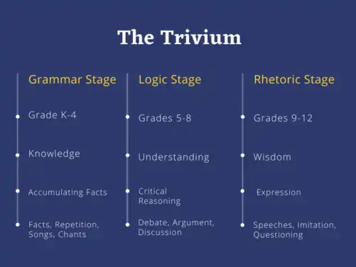 Sayers connects her three stages with the three liberal language arts (trivium): grammar, logic, and rhetoric, respectively.[16] While grammar, logic, and rhetoric are taught as subjects in classical schools, many schools also use these three arts as a paradigm for child development.[2]