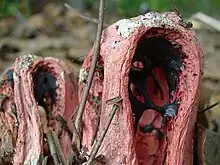 Clathrus columnatus, commonly known as the column stinkhorn, is a saprobic species of basidiomycete fungus in the family Phallaceae. It has a widespread distribution, and has been found in Africa, Australasia, and the Americas. It may have been introduced to North America with exotic plants. Similar to other stinkhorn fungi, the fruiting body, known as the receptaculum, starts out as a subterranean "egg" form. As the fungus develops, the receptaculum expands and erupts out of the protective volva, ultimately developing into mature structures characterized by two to five long vertical orange or red spongy columns, joined at the apex. The fully grown receptaculum reaches heights of 8 cm (3.1 in) tall. The inside surfaces of the columns are covered with a fetid olive-brown spore-containing slime, which attracts flies and other insects that help disseminate the spores. Although once considered undesirable, the fungus is listed as edible. It is found commonly in mulch.