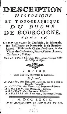 Courtépée had great interest in the history of the province of Burgundy, to which he devoted all his available time, including researches in libraries and travels around the province.[2] His Description générale et particulière du duché de Bourgogne précédée de l'abrégé historique de cette province (Dijon, 1774–85) was a highly esteemed work that was reprinted in 1846–48. Courtépée wrote an abridged version of this work.[4] His writings are generally reliable and are still used as a source. The first volume of his Description générale et particulière appeared in 1774, and the next five appeared in the six years that followed. He also undertook correction of the portable geographical dictionary, Le Vosgien, and provided some notes to the Encyclopédie.[1]