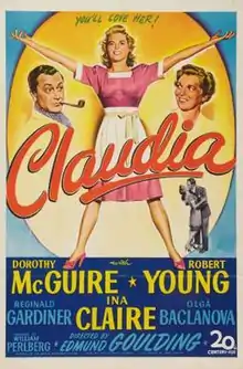 Claudia is a 1943 American comedy-drama film directed by Edmund Goulding, and written by Morrie Ryskind. The film stars Dorothy McGuire, Robert Young, Ina Claire, Reginald Gardiner, Olga Baclanova, and Jean Howard. The film was released on November 4, 1943, by 20th Century Fox.[3][4][5] The film was based on a Broadway play of the same name from 1941. It is followed by a sequel in 1946 Claudia and David.