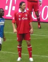 On 26 May 2012, Pizarro signed a one-year contract with his former German team, Bayern Munich.[62] On 31 October, Pizarro scored 2 goals against Kaiserslautern in the DFB-Pokal. In the Champions League match against Lille on 7 November, Pizarro scored a hat-trick within the first 33 minutes of the game as Bayern defeated their French opponents 6–1.[63] On 30 March 2013, Pizarro scored 4 goals, his firsts in the Bundesliga season, and provided two assists in a 9–2 win of Bayern Munich against Hamburg.[64] On 10 April 2013, Pizarro came off the bench to score a 90th-minute goal against Juventus in the quarter-final of the 2012–13 UEFA Champions League, which would end in a 0–2 win for Bayern Munich (0–4 in the aggregate).[65] Pizarro scored twice more and provided a further two assists in Bayern Munich's 6–1 victory over Hannover 96 on 20 April.[66] He finished the 2012–13 season with 13 goals in 28 appearances.[67]